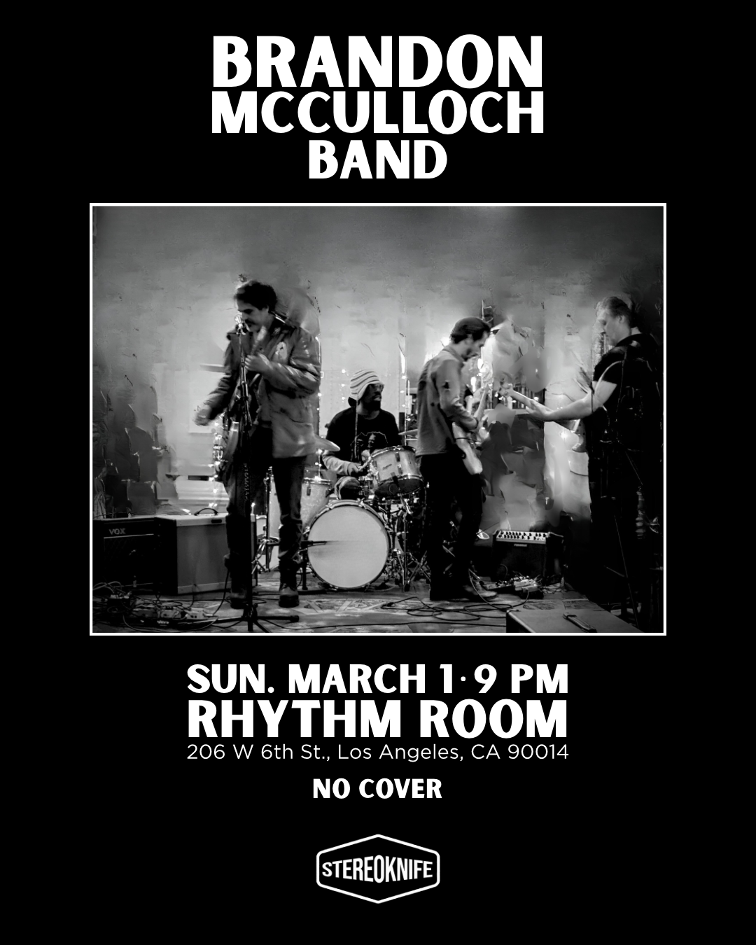Brandon McCulloch Band returns to the stage with a high-energy show at The Rhythm Room. Hailing from Hollywood, the band is composed of Vincent Fossett Jr., Craig Jackson, Josh Jacober, and Brandon McCulloch.